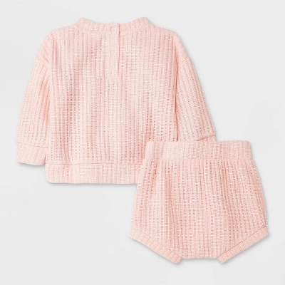 Add cute style to your baby’s day with this Chenille Sweater Top & Bottom Set from Cat & Jack™. This top and bottom set includes a crewneck sweater and bloomers, both crafted from a soft chenille fabric for soft feel and snug comfort. The crewneck sweater is designed with back snaps for ease or dressing, while the bloomers are designed with a full elastic waistband for a secure fit. Featuring a jacquard-knit construction in a solid pink hue, they’re sure to sweeten baby’s look.