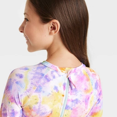 Add splashing cool style to your kid’s swimwear with the 2-Piece Tie-Dye Bikini Set from Cat & Jack™. This bikini set includes a long-sleeve rashguard pullover as well as a swim bottom, both covered with a tie-dye pattern for an eye-catching look. Both the pieces are made with a mix of soft and stretchy fabric with full lining for comfy movement both in and out of the water, and with UPF 50+ rated fabric, your kid will also get some extra protection from the sun.
