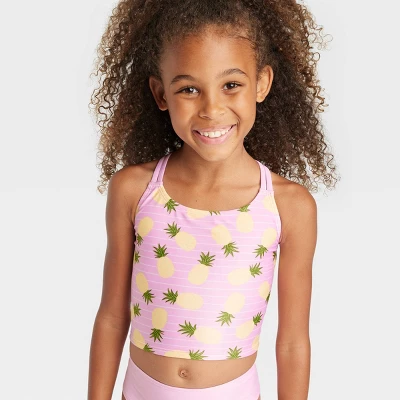 Your child will be ready for beach vacations in charming style with the Fruit Print Midkini Set from Cat & Jack™. This two-piece swimwear set includes a midkini top featuring stripes and allover pineapple print plus solid-colored boyshort bottoms for a charming look. The pieces are made from soft and stretchy fabric to offer flexibility and comfort both in and out of the water, and the UPF 50+ rated design offers them protection from the sun’s UV rays.
