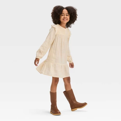 Your kid will be ready for summer days in cool, comfy style with this Long-Sleeve Woven Dress from Cat & Jack™. Falling at the knee, it features ruffle detailing on the long sleeves, smocked upper, and a front and back yoke with tiered hem for a dressier look, while the keyhole back button closure makes dressing easy. The lightweight lawn fabric with cotton lining offers comfy all-day wear, and the side pocket adds functional flair.