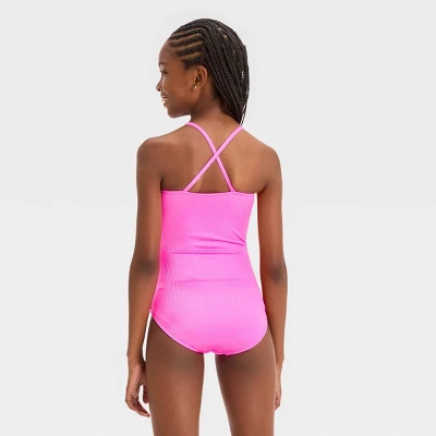 Your kid will be ready for sunny water adventures in cool style with this ‘Mermaid Dazzle’ Solid One-Piece Swimsuit from Cat & Jack™. This one-piece swimsuit features ribbed detailing on the bodice with a keyhole front and crisscross back for a fun look. Made from soft, stretchy fabric with opaque sheerness for flexible movement, this swimsuit keeps them comfortable both in and out of water, while the UPF 50+ rated material provides added protection from the sun.